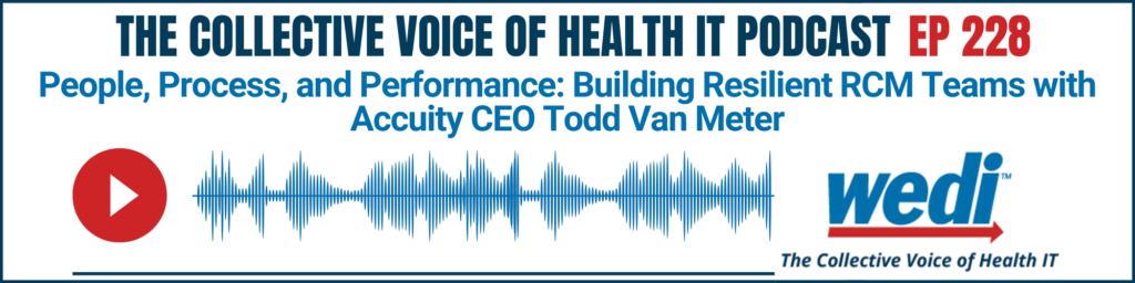 Knowledge Center Episode 228 – People, Process, and Performance: Building Resilient RCM Teams December 5, 2025 Michael welcomes Todd Van Meter, CEO of Accuity and a 30-year healthcare RCM veteran. Todd shares insights on navigating change in revenue cycle management. From separating AI hype from real ROI to building resilient teams and redefining the patient–provider–payer…