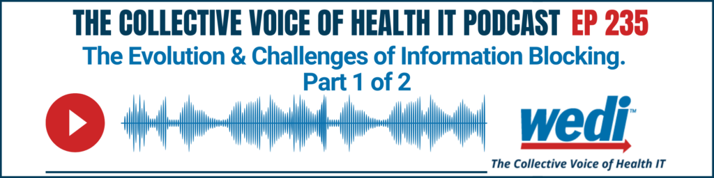 Knowledge Center Episode 235: The Evolution & Challenges of Information Blocking. Part 1 of 2 January 2, 2026 Happy New Year from WEDI! Michael offers some quick bites from our top 3 most downloaded episodes of 2025: #3: Rethinking Value-Based Care: Why Children Can’t Be Left Behind (Taylor Beery, Imagine Pediatrics, Ep 219) #2: Electronic…
