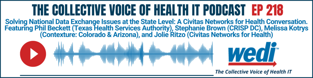 Knowledge Center Episode 218 – Solving National Data Exchange Issues at the State Level: A Civitas Networks for Health Conversation September 12, 2025 From WEDI’s 2025 Spring Conference, Civitas Networks for Health Interim CEO Jolie Ritzo welcomes three HIE leaders to discuss how they are addressing various data exchange use cases from their unique state…