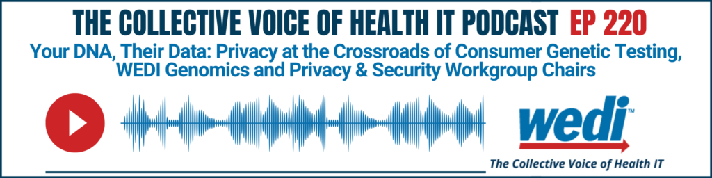 Knowledge Center Episode 220- Your DNA, Their Data: Privacy at the Crossroads of Consumer Genetic Testing, WEDI Genomics and Privacy & Security Workgroup Chairs September 26, 2025 Michael welcomes Dr. Sandy Rolfe, WEDI’s Genomics Workgroup Chair Clinical Content Lead, InterQual, Optum Insight Lesley Berkeyheiser, WEDI’s Privacy & Security Workgroup Co-Chair, Assessor with DirectTrust Thanh Thien…