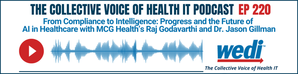Knowledge Center Episode 221- From Compliance to Intelligence: CMS-0057-F Progress and the Future of AI in Healthcare: Sponsored by MCG Health August 29, 2025 From a WEDI virtual spotlight earlier this summer, hosts and WEDI Privacy & Security Work Group Co-Chairs Lesley Berkeyheiser (DirectTrust) and Thanh-Thien Nguyen (Kaiser Permanente) moderate a conversation with Healthcare Sector…