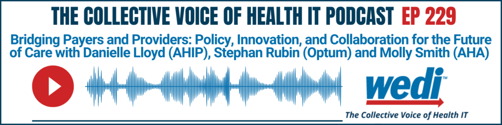 Knowledge Center Episode 230- Bridging Innovation and Compliance: Preparing for CMS-0057-F in 2027: Steve Berkow (InterSystems), Anna Taylor (MultiCare), Stephan Rubin (Optum) November 14, 2025 From WEDI’s recently concluded National Conference in Washington DC, co-chairs Emma Andelson from the American Medical Association and Anna Hyde from the Arthritis Foundation introduce WEDI’s newest workgroup, Patient Experience.…