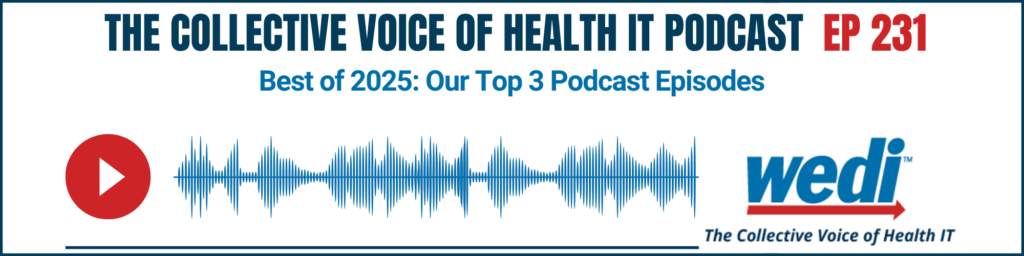 Knowledge Center Episode 231- Best of 2025- Our Top 3 Podcast Episodes January 2, 2026 Happy New Year from WEDI! Michael offers some quick bites from our top 3 most downloaded episodes of 2025: #3: Rethinking Value-Based Care: Why Children Can’t Be Left Behind (Taylor Beery, Imagine Pediatrics, Ep 219) #2: Electronic Health Records- An…